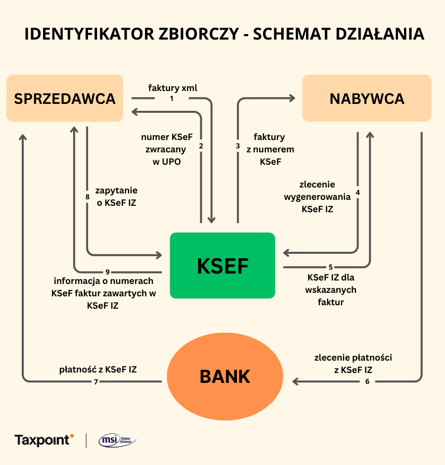 Zbiorczy identyfikator płatności (KSeF IZ) to numer agregujący nadawany dla co najmniej dwóch faktur wystawionych przez tego samego sprzedawcę. Pozwala on na powiązanie jednego przelewu z konkretnym zbiorem faktur ustrukturyzowanych znajdujących się w KSeF. Pod względem budowy, identyfikator zbiorczy zbliżony jest do numeru KSeF faktury ustrukturyzowanej. KSeF IZ składa się z 35 znaków (łącznie z oddzielającymi je pauzami) i tworzy go kombinacja danych identyfikacyjnych oraz technicznych. Pierwsze 10 znaków to NIP podmiotu generującego KSeF IZ. Kolejne 8 znaków obejmuje symbol „IZ”, który jednoznacznie wskazuje, że mamy do czynienia z identyfikatorem zbiorczym, oraz rok i miesiąc jego wygenerowania. Całość uzupełnia unikalny, automatycznie wyliczany ciąg 12 znaków oraz dwie cyfry kontrolne, również generowane przez KSeF.